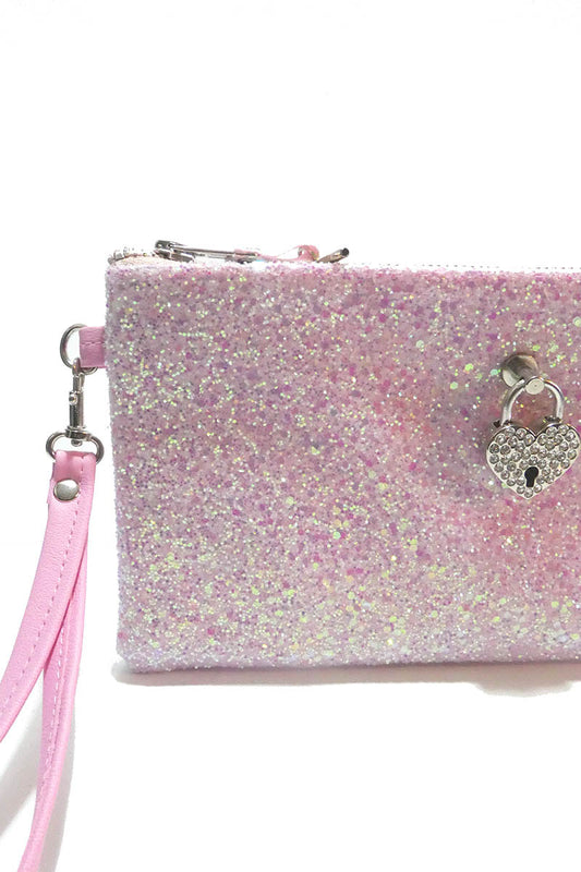Clutch bag w/ padlock in Pale Iridescent Pink Glitter