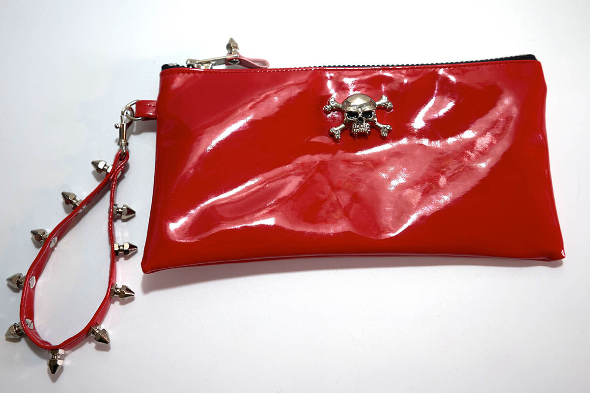Beautiful clutch bag with removable strap for any and all your most precious accessories! Made in black gloss leather (pvc), decorated with a chunky skull and crossbones and lined with bright red satin on black pvc, or black satin on the red and purple pvc.. The removable wrist strap is decorated with gleaming hex spikes and the extra chunky silver zip is decorated with a spike. Dimensions are: 25cm wide x 14cm high / 10 inches wide x 5 1/2 inches high.