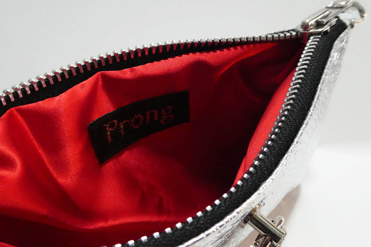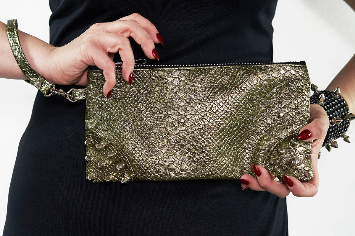 Indulge in the luxurious charm of our Clutch bag with a detachable strap. Crafted with high-quality snake print PU leather, this bag boasts edgy spiked corners and a sophisticated black satin lining. Adorned with a chunky silver zipper accented by a single spike, this bag measures 25cm wide x 14cm high / 10 inches wide x 5 1/2 inches high.
