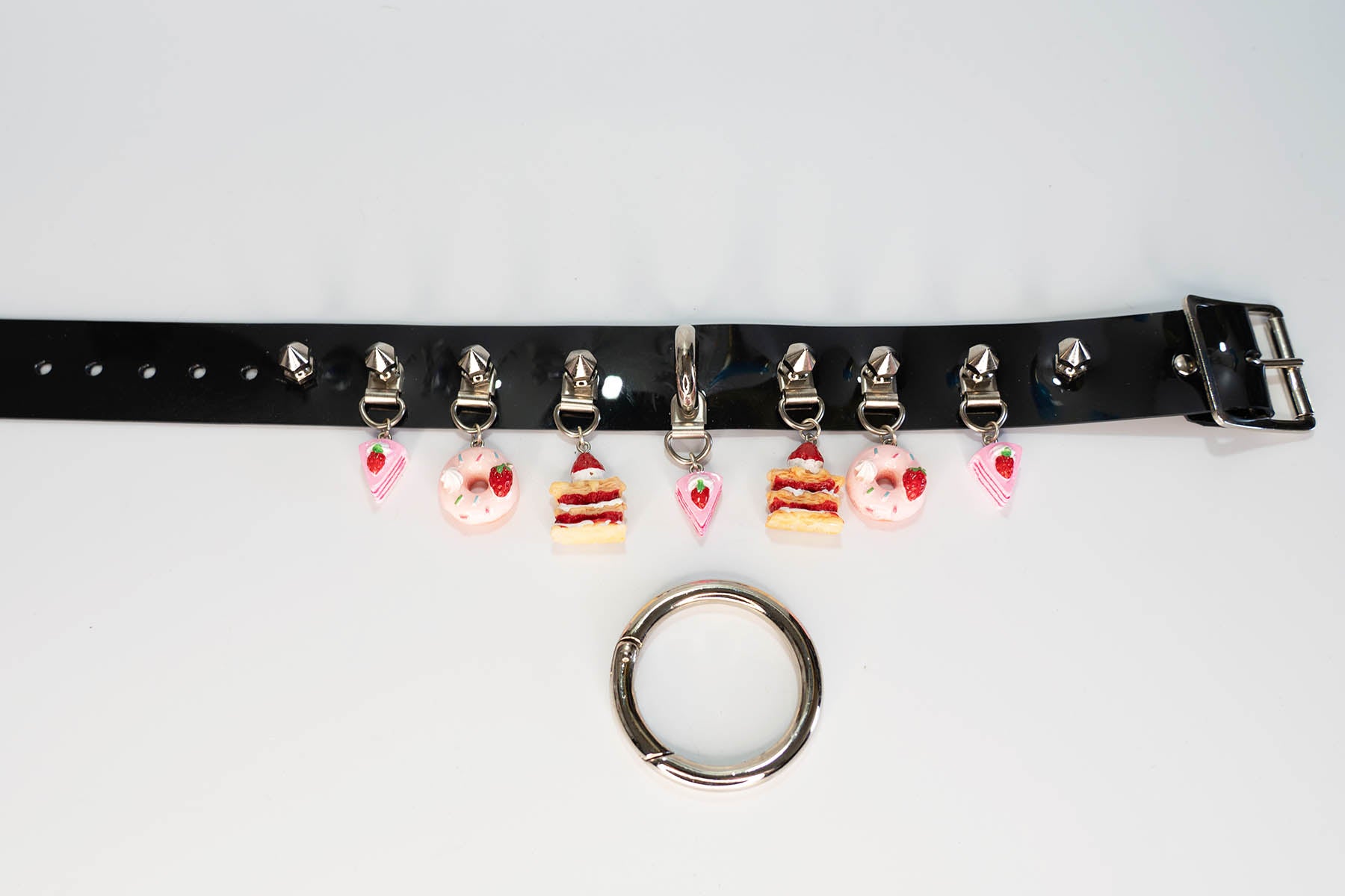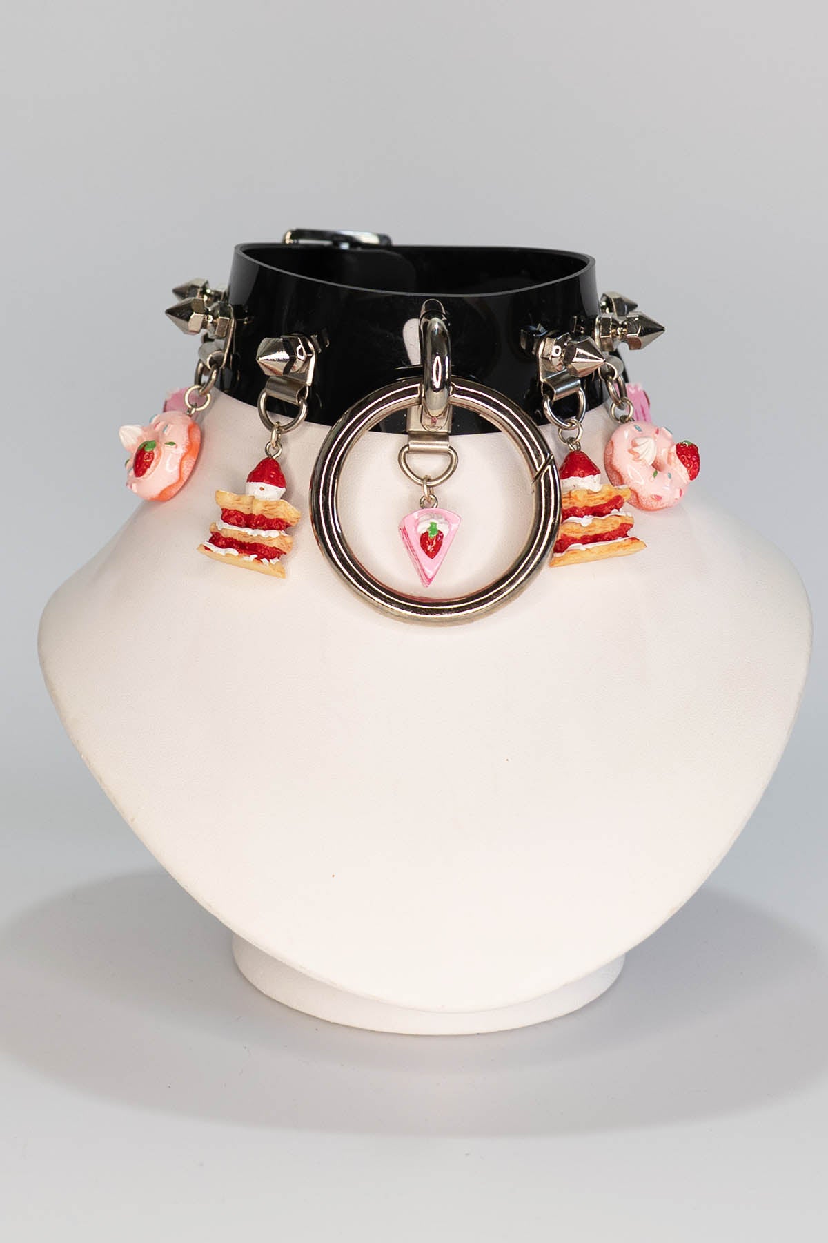 Beautiful choker in high-shine pvc with a large round carabiner clasp decorated with temptingly tasty cake charms!