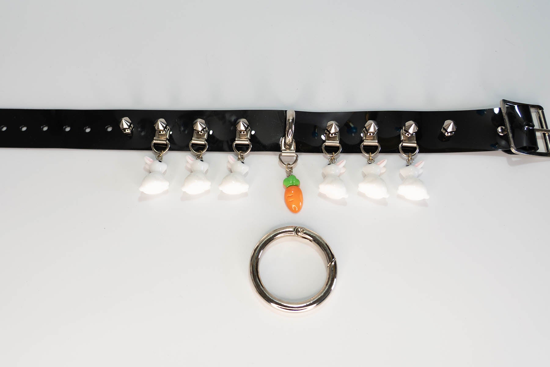 Beautiful choker in high-shine pvc with a large round carabiner clasp decorated with cheeky bunny rabbits and a carrot charms!
