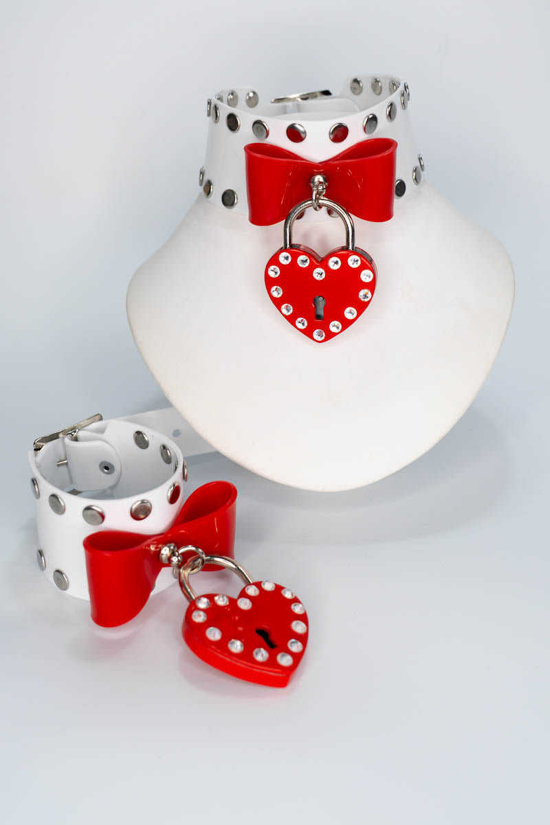 A bold white pvc bracelet measuring 1¾ inches/4.5cm wide, finished with edgy riveted detailing and a cheeky red pvc bow. Select your heart-shaped padlock in white with ruby-red crystals or red with sparkling clear stones to complete this flirtatious look. Pure playful luxury!