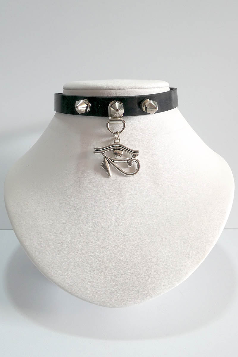 Stunning rubber choker decorated with a beautiful Eye of Horus pendant. Will fit a neck size between 11 1/2 inches/29cm and 19 inches/48cm. We cut our straps long, simply cut down with scissors when you know your size!
