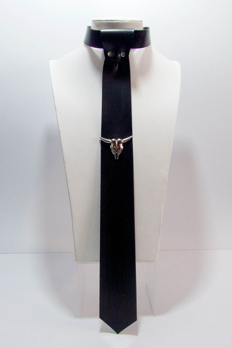 Embellished with a lustrous cow skull stud, this stylish industrial skinny tie is designed with a flexible rubber material that can be left matte or polished with Silicone spray. The tie elegantly slides along a 1-inch wide choker strap and secures with a buckle at the back. It is available in a standard neck size of 12 to 20 inches (30cm to 51cm) and can be trimmed with scissors for a perfect fit.