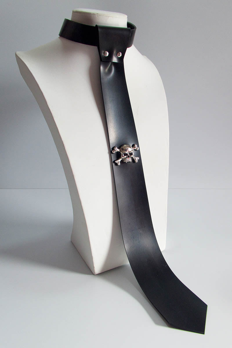 This rugged skinny tie is adorned with a bold skull and crossbones stud. Keep the rubber matte or spruce it up with a touch of Silicone spray. The tie glides along a thick rubber choker strap, secured with a buckle at the back.