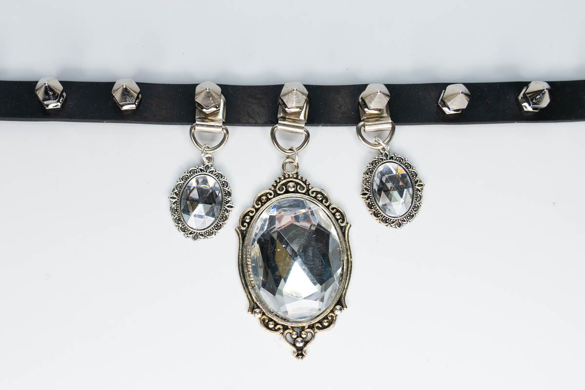 This rubber choker features an three acrylic crystal pendants placed in a silver tone baroque mounts, and decorated with shining hexagonal spikes. It securely fastens at the back with a buckle and is adjustable to fit neck sizes ranging from 11 1/12 inches (29cm) to 17 inches (43cm). Choose from a variety of crystal colours including clear, red, black, purple and green.